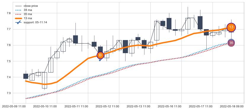 上涨趋势05-09 11:00-05-18 09:00,均线13确认关键支撑1处