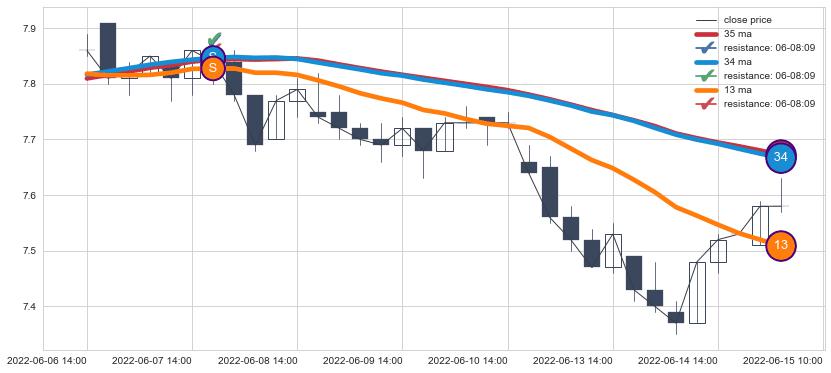 下跌趋势06-06 14:00-06-15 10:00,均线34, 35, 13确认关键阻力1处