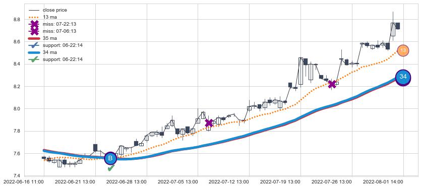 上涨趋势06-16 11:00-08-01 14:00,均线34, 35确认关键支撑1处