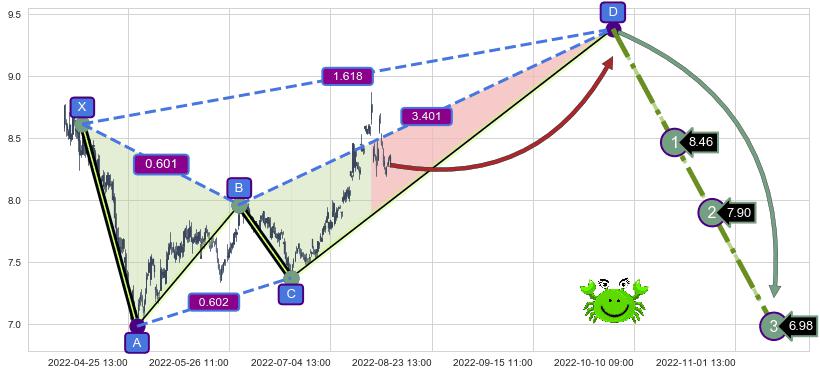 ➢ 距离预测D点位置有足够的上涨空间, 与看跌【螃蟹】形态相反,实际方向【看涨】