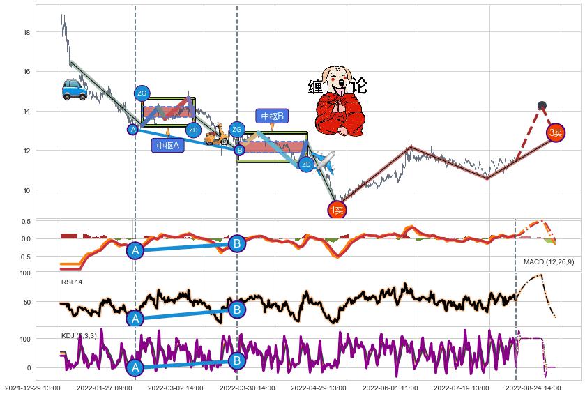 ➢ 【中枢A】:02-07:13-02-28:09,中枢由5笔构成,共73交易小时, ZG=14.16, ZD=13.76
