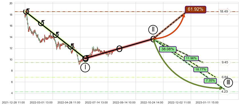 ➣ D点拟合预测价格14.31,距离最后交易收盘价格11.43相差 +25.18%