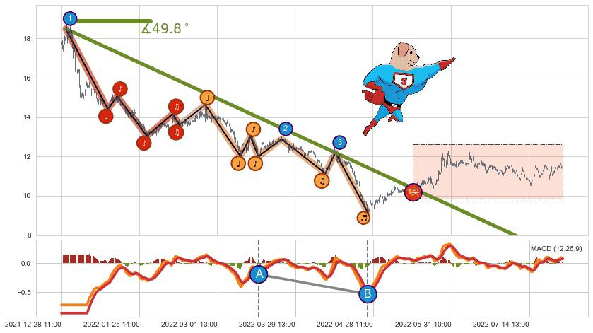 从2021-12-29 13:00至2022-05-11 10:00,共包含424个小时,阶段股价下跌-54.81%,阶段股价变动位移路程比: 1 : 6,下跌趋势角度: 49.8