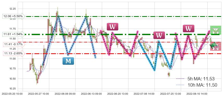 ♘ 阻力价格位11.61,可信任强度92.19%,距离最后交易2022-08-12 14:00形成的收盘价格11.43相差 +1.54%