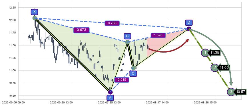 ➢ 距离预测D点位置尚有上涨空间,短线依然【看涨】, 耐心等待看跌【伽利】形态反转启动