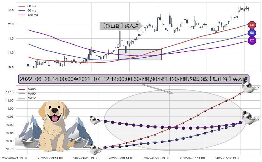 形态多维评估: ⚀ 2022-06-29 13:00:00-小时至2022-07-12 14:00:00-小时显现 60小时-90小时-120小时均线 【银山谷】买入点 看多信号,后市看涨,买入