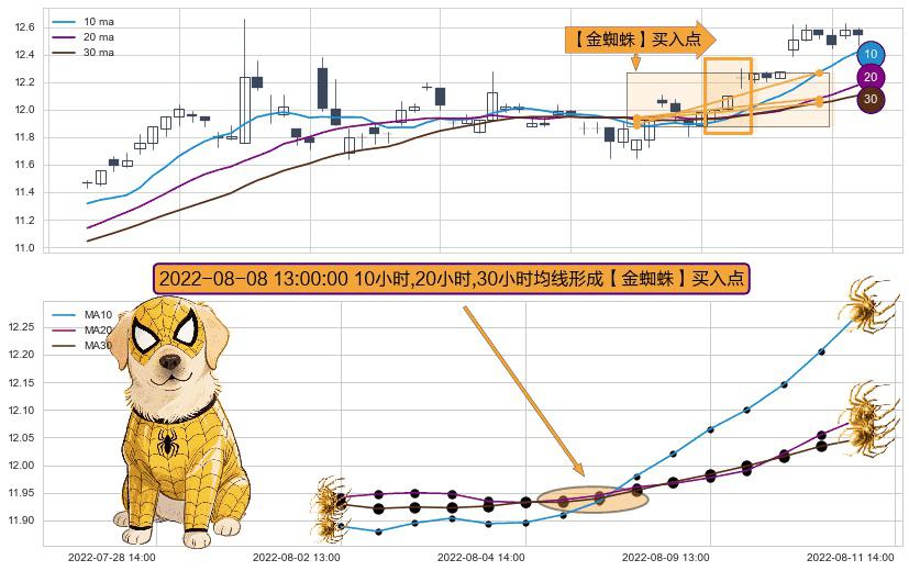 形态多维评估: ⚀ 2022-08-08 13:00:00小时显现 10小时-20小时-30小时均线 【金蜘蛛】买入点 看多信号,后市看涨,买入