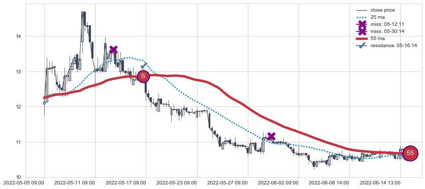 下跌趋势05-05 09:00-06-14 14:00,均线55确认关键阻力1处