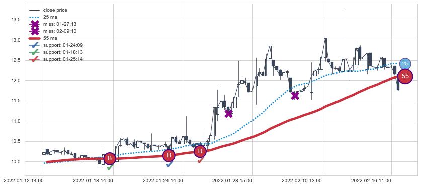 上涨趋势06-13 14:00-07-15 14:00,均线25, 55确认关键支撑4处