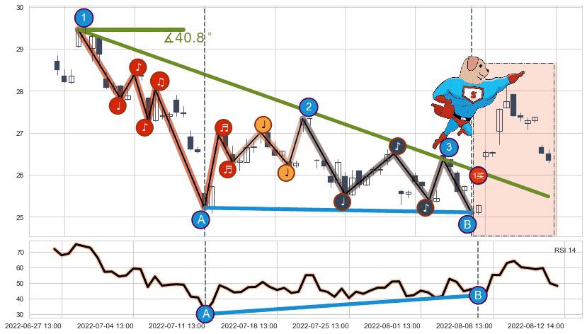 从2022-06-28 13:00至2022-07-14 14:00,共包含26个小时,阶段股价下跌-9.38%,阶段股价变动位移路程比: 1 : 3,下跌趋势角度: 62.5