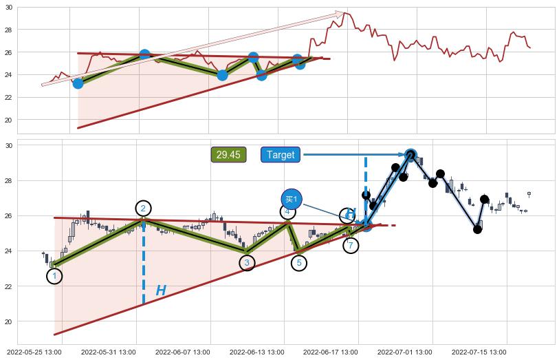 ➢ 最小中继整理涨幅→𝐇: 4.81 (高点逐步降低斜边第一阻力点②与支撑边垂直距离)