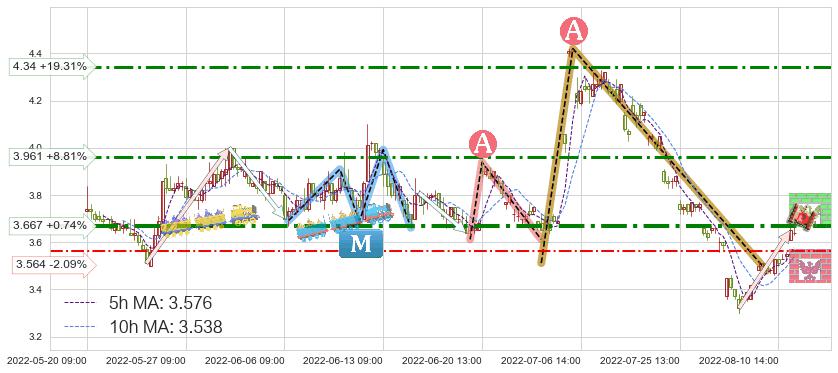 ♘ 阻力价格位3.667,可信任强度81.29%,距离最后交易2022-08-12 14:00形成的收盘价格3.640相差 +0.74%