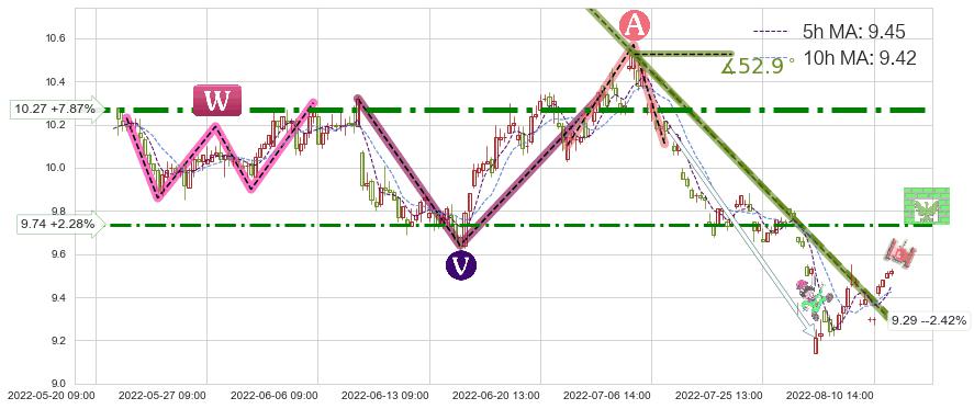 ♘ 阻力价格位10.27,可信任强度97.61%,距离最后交易2022-08-12 14:00形成的收盘价格9.52相差 +7.87%