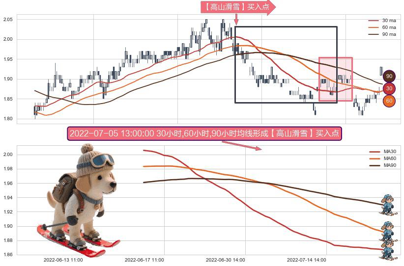 ⚀ 2022-06-16 11:00:00小时-2022-07-25 14:00:00小时显现 30小时-60小时-90小时均线 【高山滑雪】买入点 看多信号,后市看涨,买入
