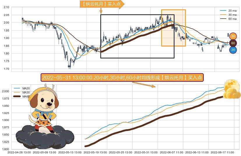 ⚀ 2022-05-16 10:00:00小时-2022-06-16 13:00:00小时显现 20小时-30小时-60小时均线 【烘云托月】买入点 看多信号,后市看涨,买入