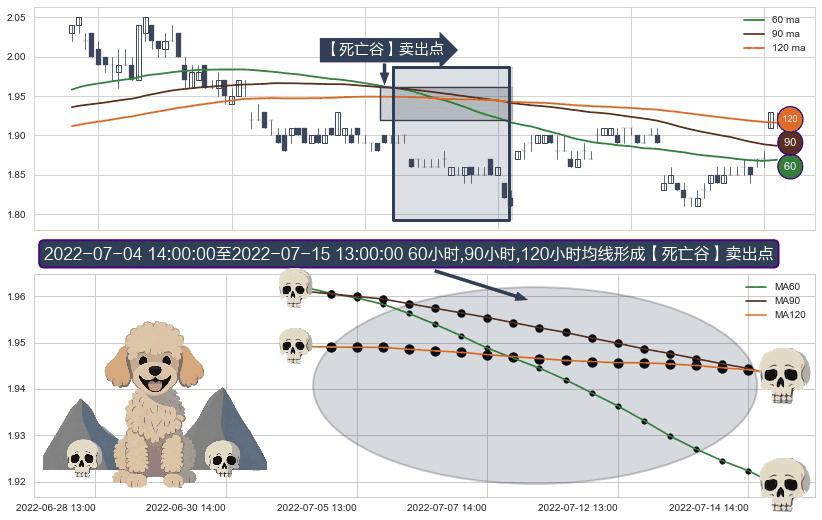 ⚀ 2022-07-05 13:00:00-小时至2022-07-15 13:00:00-小时显现 60小时-90小时-120小时均线 【死亡谷】卖出点 看空信号,后市看跌,卖出
