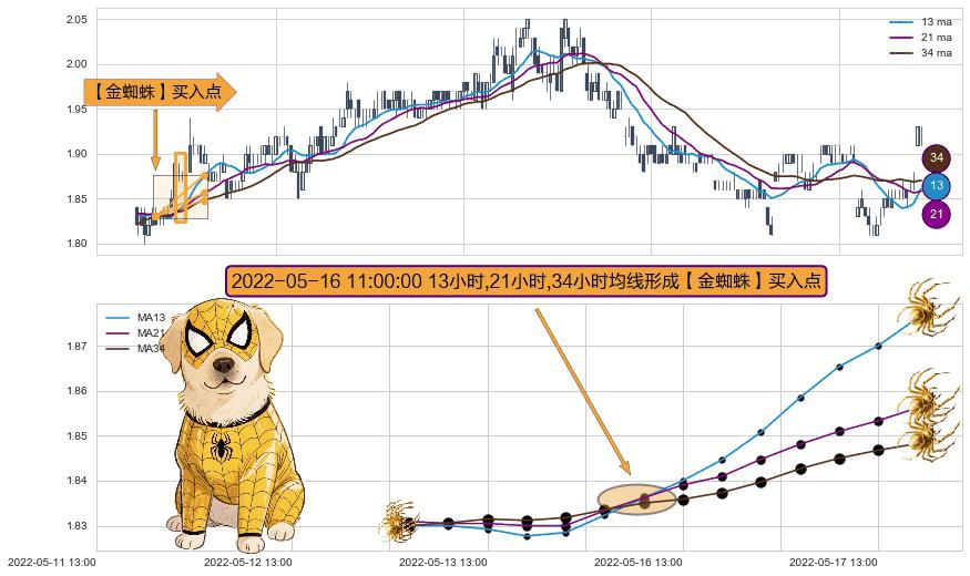⚀ 2022-05-16 11:00:00小时显现 13小时-21小时-34小时均线 【金蜘蛛】买入点 看多信号,后市看涨,买入