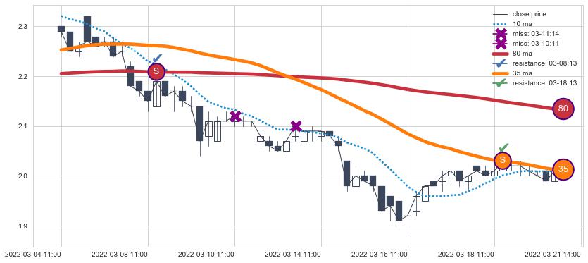 03-08 09:00至03-29 10:00 慢线与快线呈空头排列, 慢线与快线接触少,无缠绕