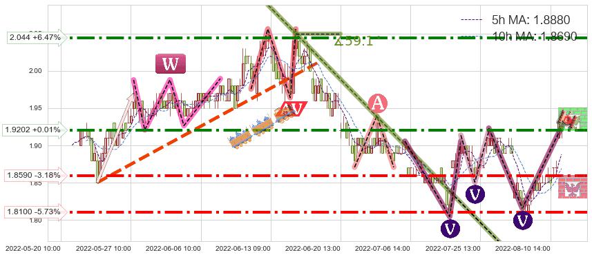 ♘ 阻力价格位1.9202,可信任强度84.28%,距离最后交易2022-08-12 14:00形成的收盘价格1.9200相差 +0.01%