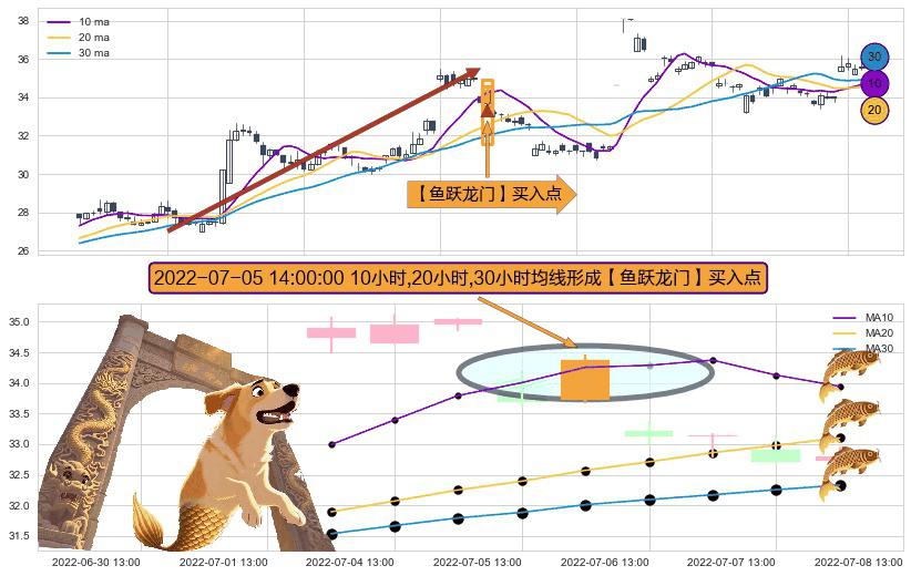 形态多维评估: ⚀ 2022-07-05 14:00:00小时显现 10小时-20小时-30小时均线 【鱼跃龙门】买入点 看多信号,后市看涨,买入