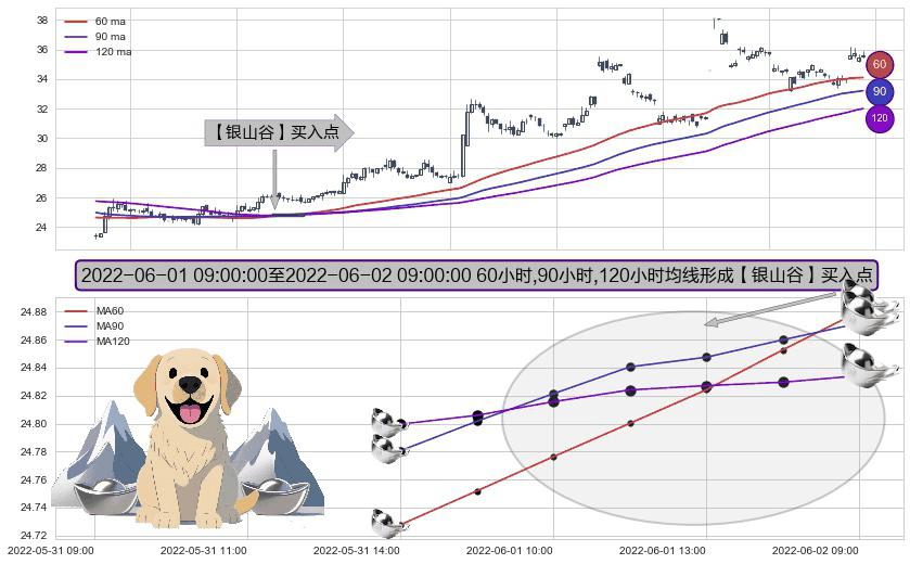 形态多维评估: ⚀ 2022-06-01 10:00:00-小时至2022-06-02 09:00:00-小时显现 60小时-90小时-120小时均线 【银山谷】买入点 看多信号,后市看涨,买入