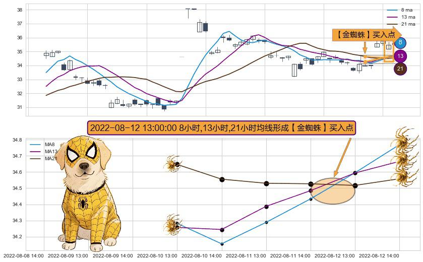 形态多维评估: ⚀ 2022-08-12 13:00:00小时显现 8小时-13小时-21小时均线 【金蜘蛛】买入点 看多信号,后市看涨,买入