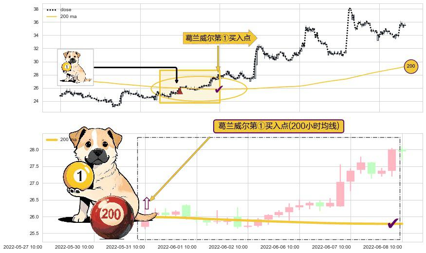 形态多维评估: ⚀ 2022-05-31 10:00:00-小时显现 葛兰威尔均线 200小时均线 第买①入点 走势反转见底信号,后市看涨,买进信号