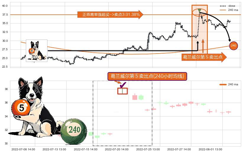 形态多维评估: ⚀ 2022-07-20 13:00:00-小时显现 葛兰威尔均线 240小时均线 第⑤卖出点 上升趋势均值回复的短线回落信号,后市看跌,卖出信号