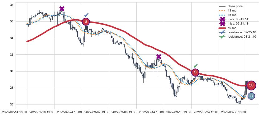 下跌趋势02-14 13:00-03-30 14:00,均线50确认关键阻力2处