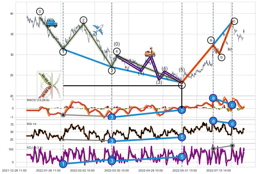 ➣ 1,3,5驱动浪MACD, RSI, KDJ走势都出现【常规背离】反转信号增强