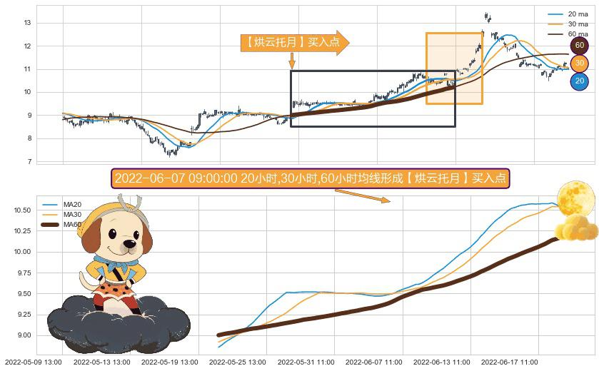 ⚀ 2022-05-20 14:00:00小时-2022-06-23 13:00:00小时显现 20小时-30小时-60小时均线 【烘云托月】买入点 看多信号,后市看涨,买入