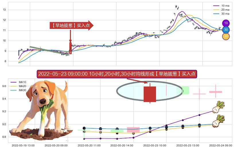 ⚀ 2022-05-23 09:00:00小时显现 10小时-20小时-30小时均线 【旱地拔葱】买入点 看多信号,后市看涨,买入