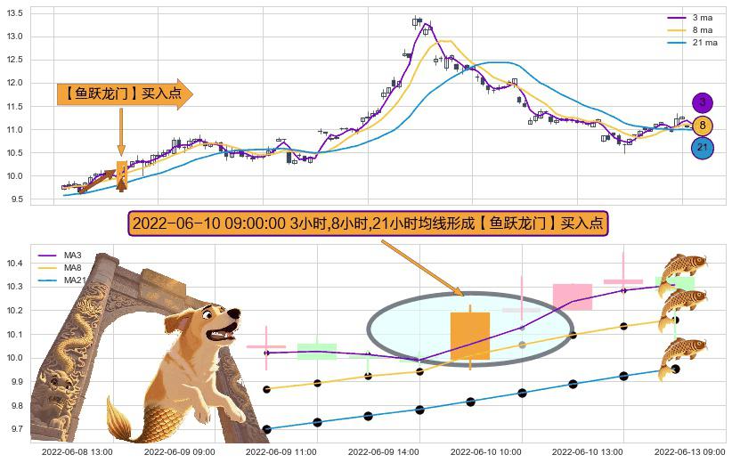 ⚀ 2022-06-10 09:00:00小时显现 3小时-8小时-21小时均线 【鱼跃龙门】买入点 看多信号,后市看涨,买入