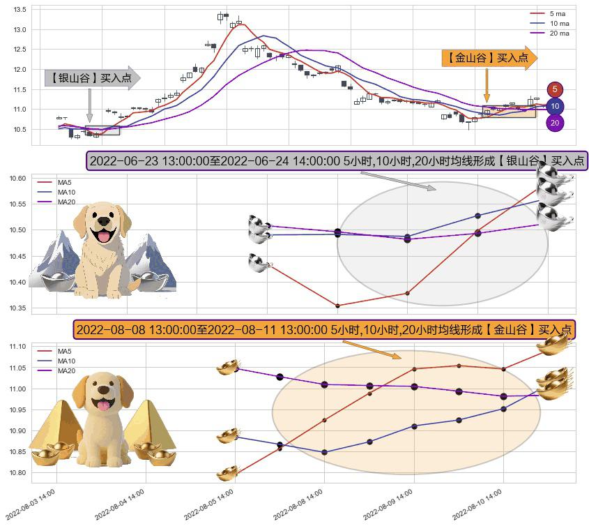 ⚃ 2022-08-08 14:00:00-小时至2022-08-11 13:00:00-小时显现 5小时-10小时-20小时均线 【金山谷】买入点 其再次确认了买入信号,可靠性更强,买入