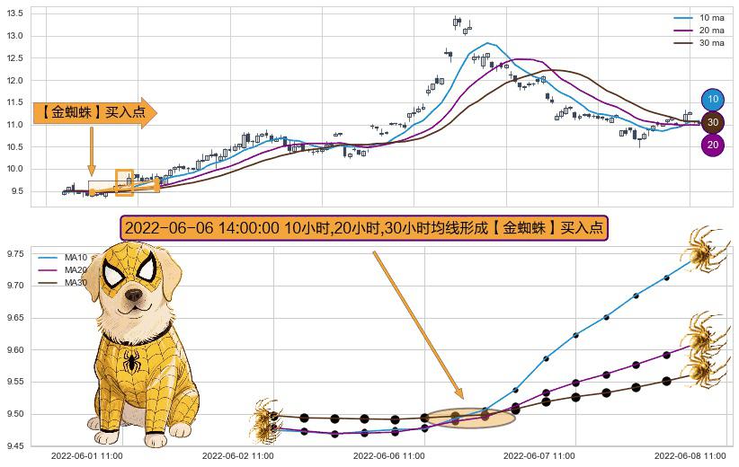⚀ 2022-06-06 14:00:00小时显现 10小时-20小时-30小时均线 【金蜘蛛】买入点 看多信号,后市看涨,买入