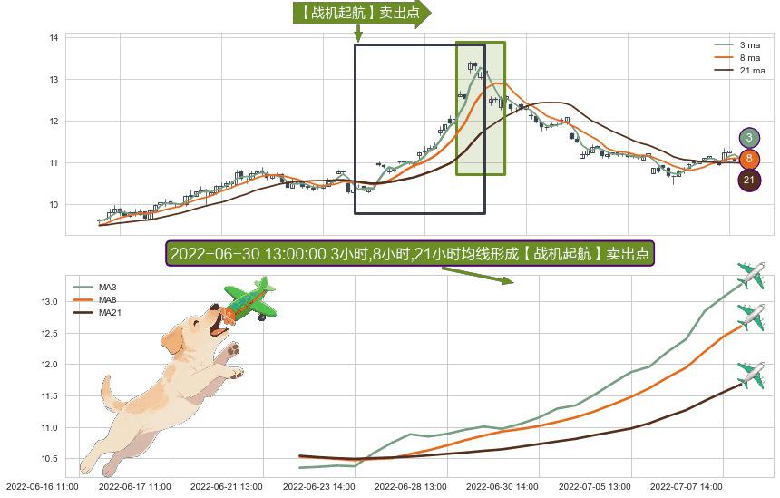 ⚀ 2022-06-22 13:00:00小时-2022-07-08 13:00:00小时显现 3小时-8小时-21小时均线 【战机起航】卖出点 看空信号,后市看跌,卖出