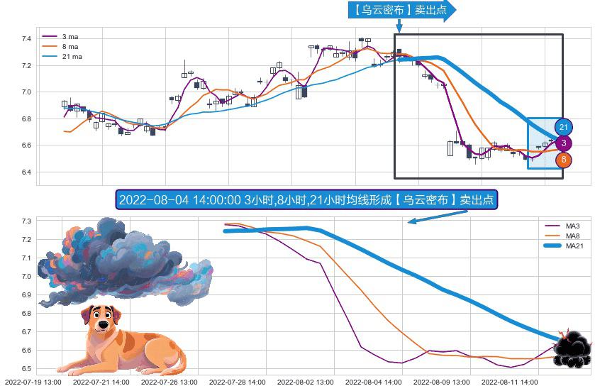 形态多维评估: ⚀ 2022-07-27 13:00:00小时-2022-08-12 14:00:00小时显现 3小时-8小时-21小时均线 【乌云密布】卖出点 看空信号,后市看跌,卖出