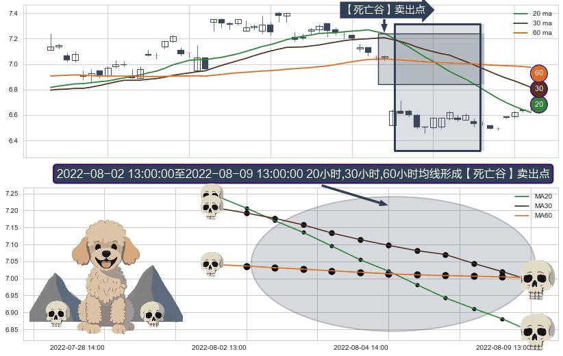 形态多维评估: ⚀ 2022-08-02 14:00:00-小时至2022-08-09 13:00:00-小时显现 20小时-30小时-60小时均线 【死亡谷】卖出点 看空信号,后市看跌,卖出