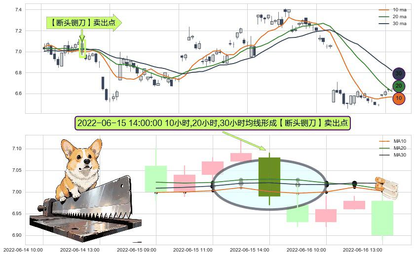 形态多维评估: ⚀ 2022-06-15 14:00:00小时显现 10小时-20小时-30小时均线 【断头铡刀】卖出点 看空信号,后市看跌,卖出