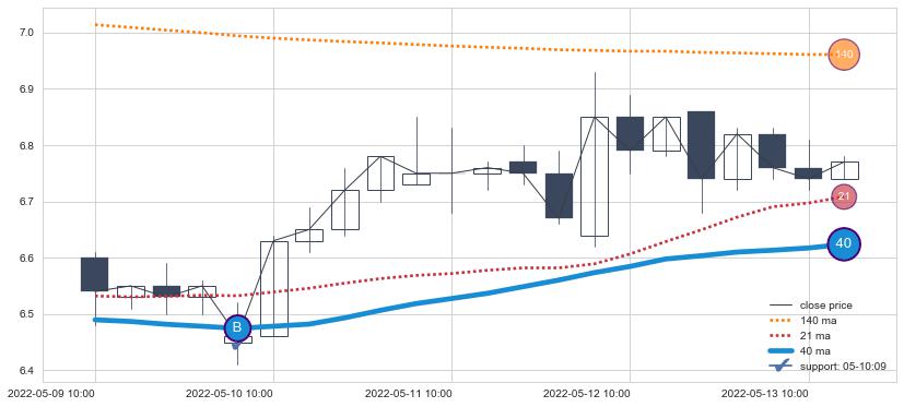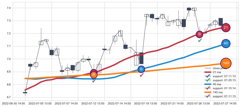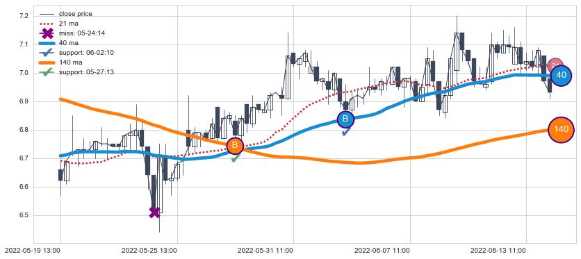 上涨趋势06-30 14:00-07-27 14:00,均线40, 140, 21确认关键支撑3处