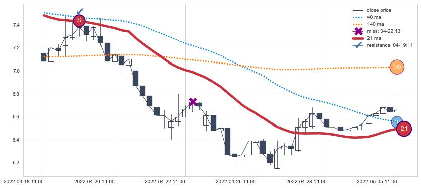 上涨趋势05-19 13:00-06-14 10:00,均线40, 140确认关键支撑2处