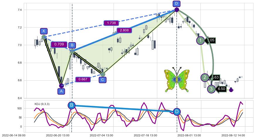 ➣ 已完成【蝴蝶】形态起点X: 06-15:13, 终点D: 07-22:14, 共62交易小时