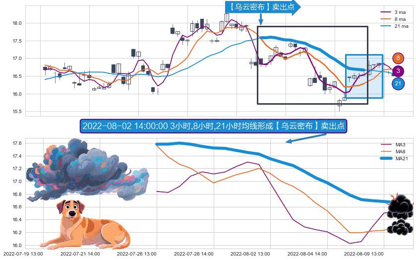 形态多维评估: ⚀ 2022-07-26 13:00:00小时-2022-08-09 14:00:00小时显现 3小时-8小时-21小时均线 【乌云密布】卖出点 看空信号,后市看跌,卖出
