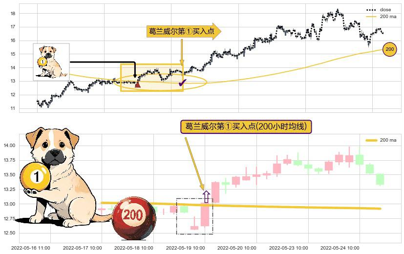 形态多维评估: ⚀ 2022-05-19 10:00:00-小时显现 葛兰威尔均线 200小时均线 第买①入点 走势反转见底信号,后市看涨,买进信号
