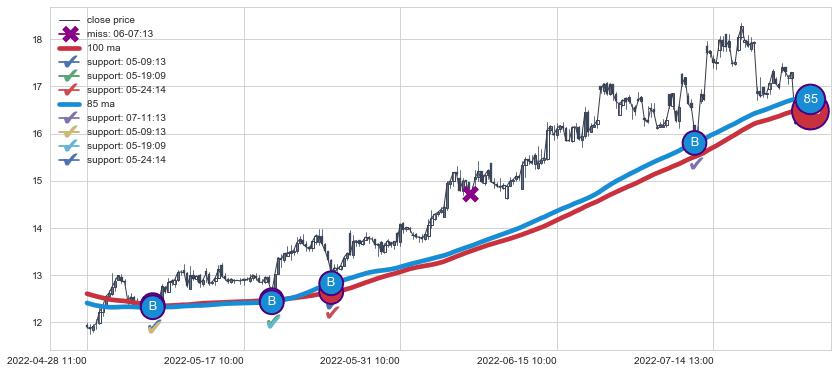 上涨趋势04-28 11:00-08-02 13:00,均线100, 85确认关键支撑4处