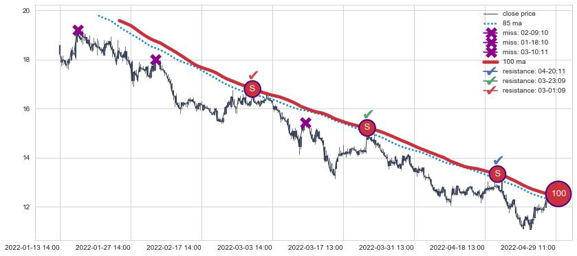 下跌趋势01-13 14:00-04-29 11:00,均线100确认关键阻力3处