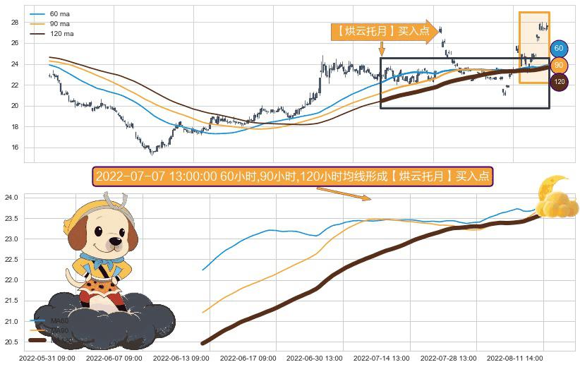 形态多维评估: ⚀ 2022-06-10 13:00:00小时-2022-08-12 14:00:00小时显现 60小时-90小时-120小时均线 【烘云托月】买入点 看多信号,后市看涨,买入