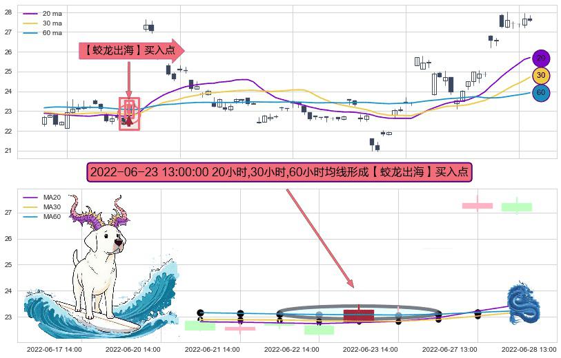 形态多维评估: ⚀ 2022-06-23 13:00:00小时显现 20小时-30小时-60小时均线 【蛟龙出海】买入点 看多信号,后市看涨,买入
