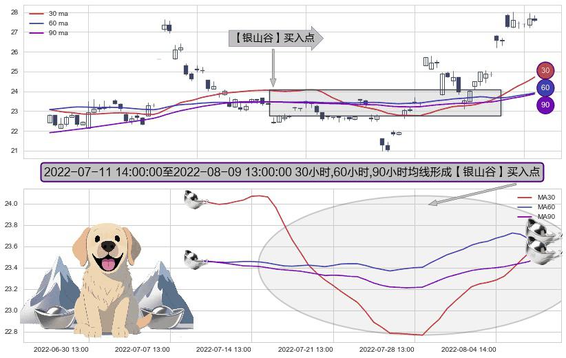形态多维评估: ⚀ 2022-07-12 13:00:00-小时至2022-08-09 13:00:00-小时显现 30小时-60小时-90小时均线 【银山谷】买入点 看多信号,后市看涨,买入