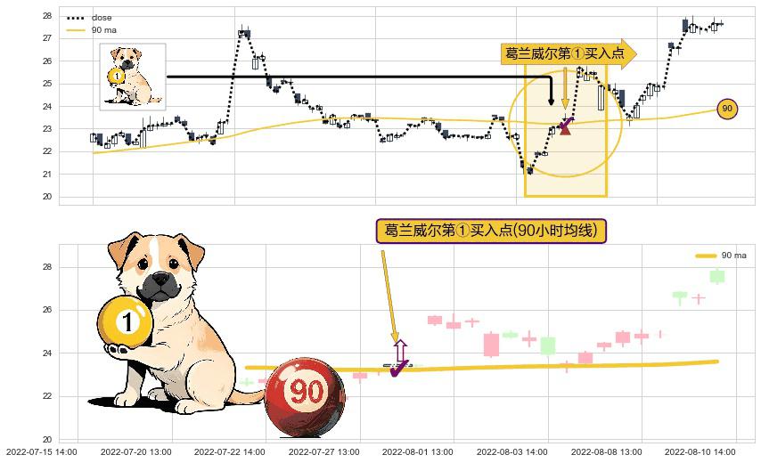 形态多维评估: ⚀ 2022-07-28 13:00:00-小时显现 葛兰威尔均线 90小时均线 第买①入点 走势反转见底信号,后市看涨,买进信号